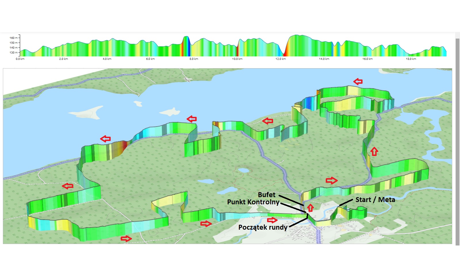 - ok. 18 km + dojazd do rundy o długości 650 metrów i powrót do mety o długosci 1350 metrów.